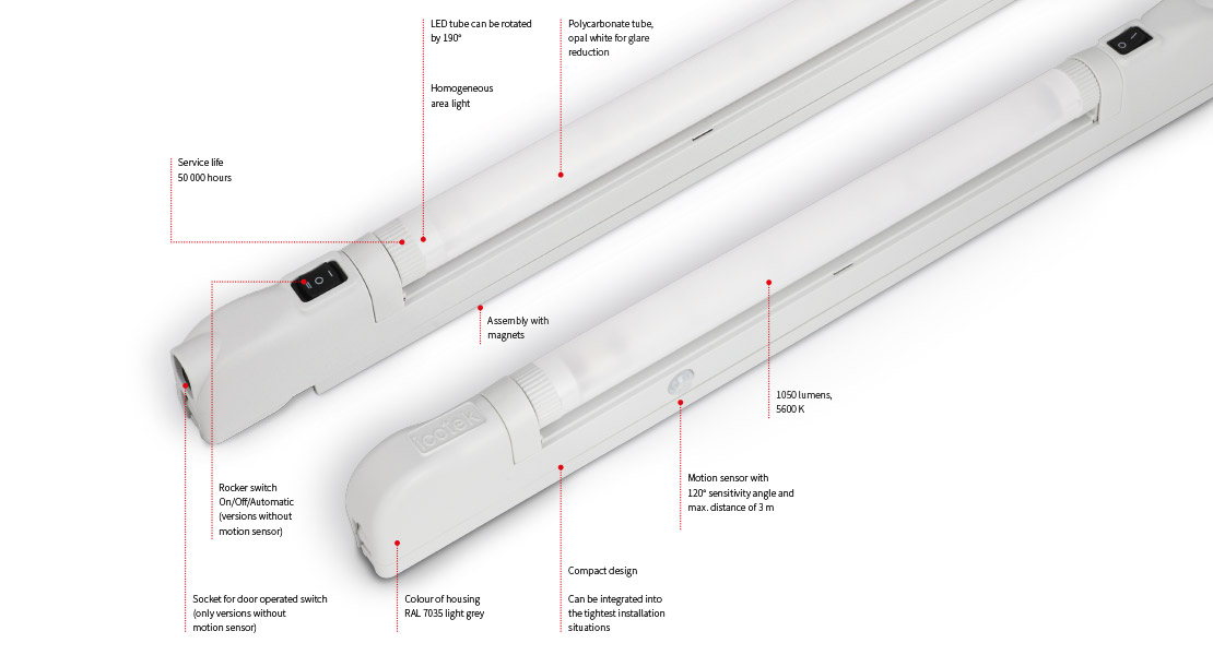 The High Power LED illuminates with 1050 lumens and offers a service life of 50,000 hours. The opal white polycarbonate tube provides a homogeneous, glare-free area light.