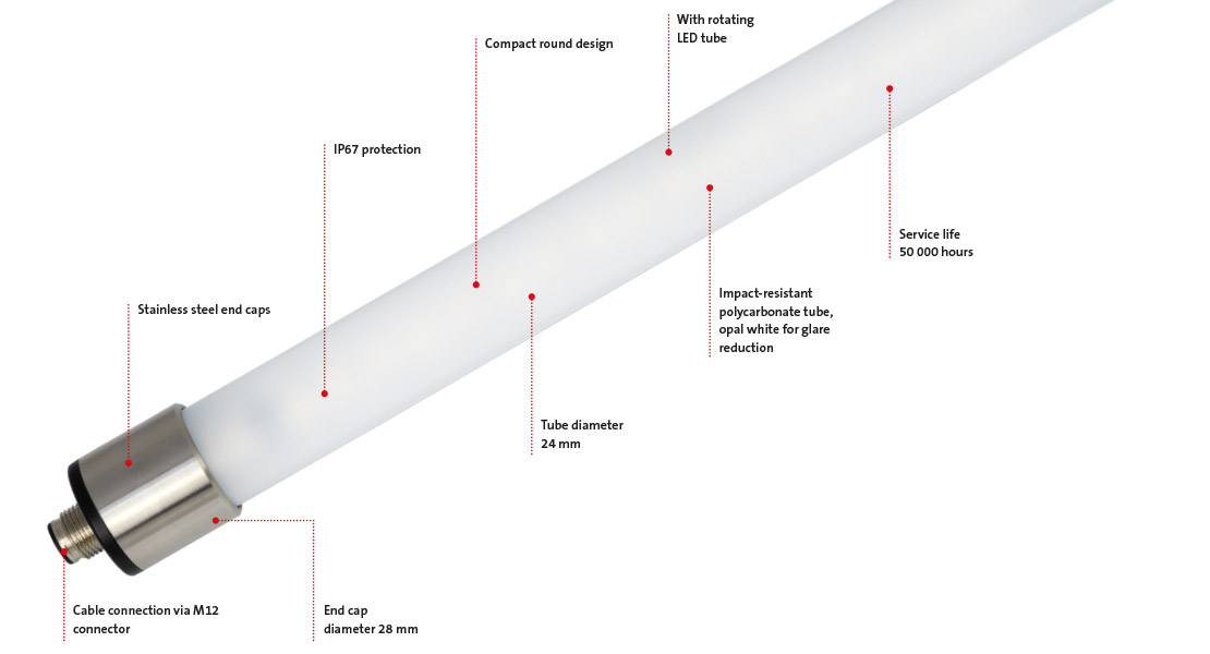 The TUBE system luminaire provides effective lighting for machinery and equipment, with M12 connectors for standardised connection.