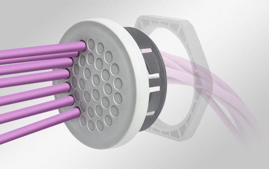 Las placas pasacables KEL-DPFR permiten insertar varios cables con diferentes diámetros de 3 a 28 mm y sellarlos según IP66. Una gran ventaja, cuando no se conoce de antemano, cuál es el diámetro exacto del cable. Gracias a la flexibilidad y forma piramidal única, la entrada de cables y el posicionamiento flexible es mucho más fácil, comparado con el uso de prensaestopas convencionales.