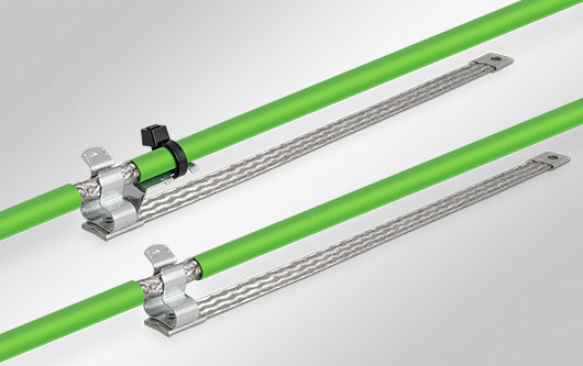 Las correas de tierra trenzadas incorporan un clip para conectar la malla de los cables en un extremo. Esta solución se emplea allí donde el espacio es muy limitado.