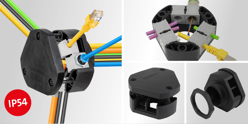 Halkaisijaltaan 1-15 mm:n kaapelit voidaan l?pivied?, reititt?? ja tiivist?? IP54 (standardin 60529) mukaisesti. Samalla j?rjestyy my?s vedonpoisto EN 62444 -standardin mukaisesti. Haaroitusl?pivienti soveltuu vakio M -aukotuksiin ja se voidaan kiinnitt?? vastamutterilla, joka sis?ltyy toimitukseen. Ruuvattavan kannen ja halkaistavien tiivisteosien k?yt?n ansiosta j?lkiasennukset, korjaukset ja huollot voidaan tehd? paljon helpommin ja nopeammin.