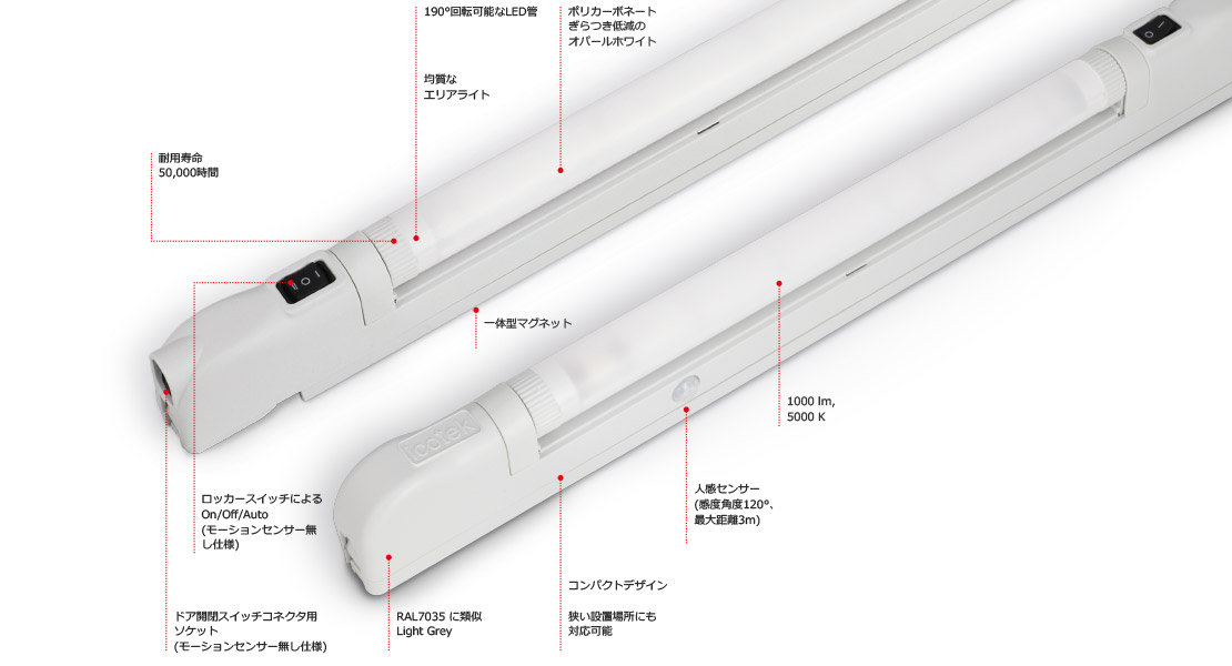 ALLIO ライトは、コンパクトなデザインと照射部が190°回転することで、省スペース設(shè)置ながら筐體內(nèi)を効果的に照らすことができます。